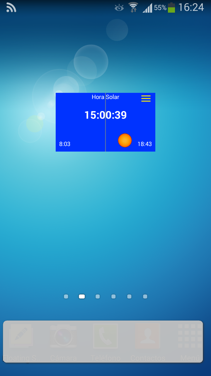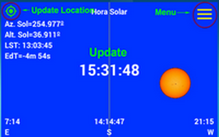 La aplicación Solar Info proporciona información sobre el movimiento diurno y la posición del sol a lo largo del año, que facilita la comprensión de fenómenos que, a pesar de sernos familiares, a veces no entendemos del todo. Resulta una útil herramienta para la instalación y ajuste de relojes de sol al proporcionar la hora solar calculada con precisión con algoritmos astronómicos. Por otra parte proporciona información sobre el movimiento diurno y la posición del sol a lo largo del año, que facilita la comprensión de fenómenos que, a pesar de sernos familiares, a veces no entendemos del todo. La hora solar se actualiza automáticamente y de forma manual al pulsar sobre cualquier parte del widget. Al pulsar sobre el icono situado en el borde superior derecho se accede al menú de la aplicación.
