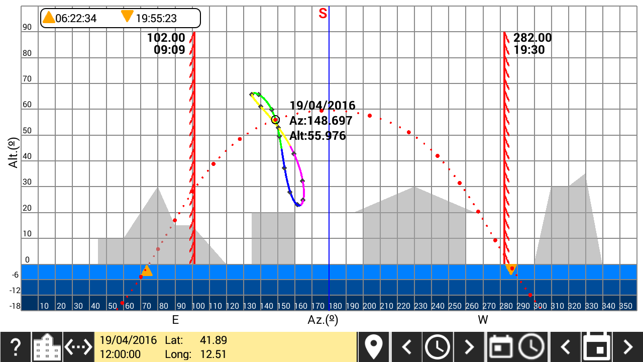A la trayectoria diurna se puede superponer una máscara de horizonte del emplazamiento y los límites de funcionamiento para un cuadrante horizontal o vertical declinante. Para construir un dispositivo para dibujar la máscara de horizonte, visitar el siguiente enlace |