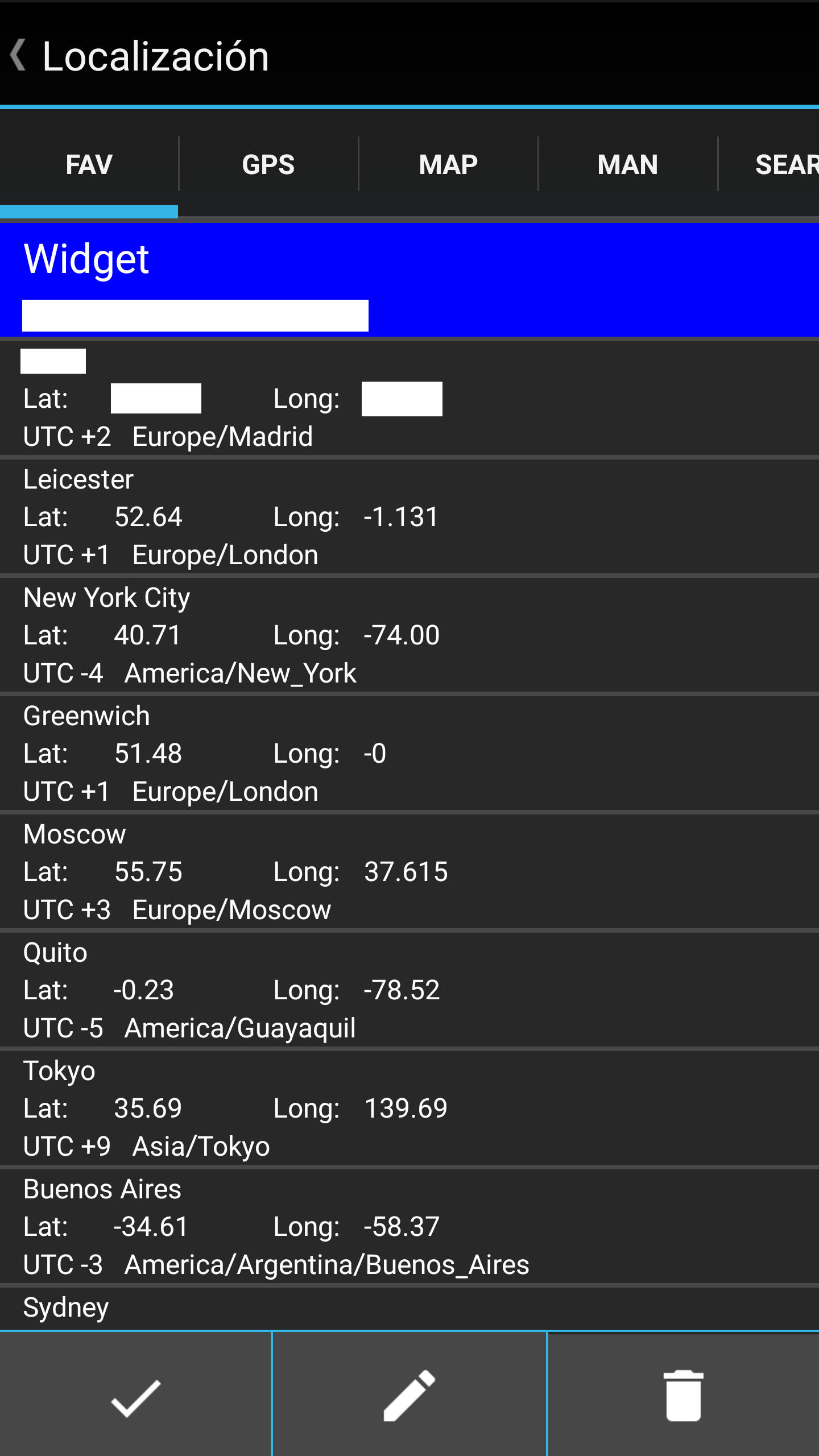 En el apartado Localización se obtienen las coordenadas del emplazamiento automáticamente o se puede introducir la Latitud y la Longitud manualmente. Se pueden configurar los widget para que periodicamente cada hora actualicen su posición. Hay que tener en cuenta que tanto la hora como la Zona Horaria (TZO) se obtienen del dispositivo por tanto si se introducen manualmente coordenadas muy alejadas de la Zona Horaria, se obtendrán datos erróneos. Si el dispositivo está configurado para ajustar la hora automáticamente, la precisión obtenida puede ser del orden de ±5 segundos.