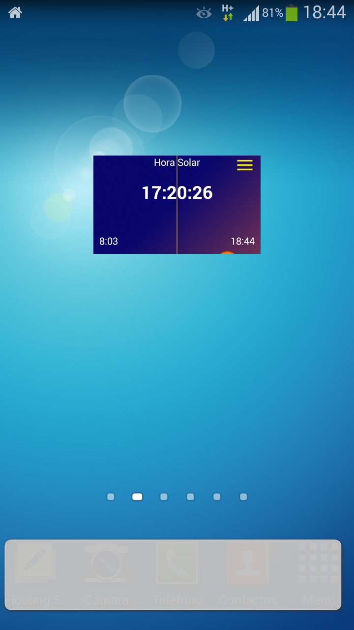 El widget se coloca en cualquier pantalla de inicio. Muestra la hora solar en el emplazamiento, las horas de salida y puesta de sol y su posición en el cielo. |