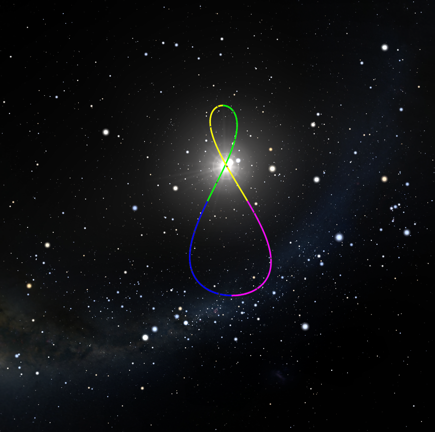 Puede verse la trayectoria diurna del Sol junto con el analema horario. Tanto la fecha como la hora del analema puede modificarse. |